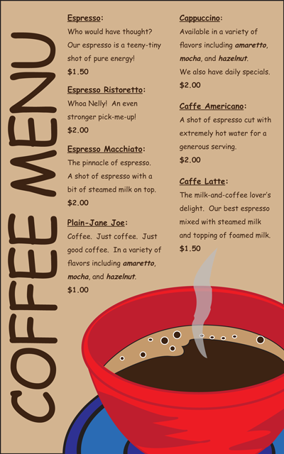 This is a menu I designed for an unspecified coffee shop.